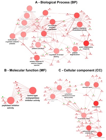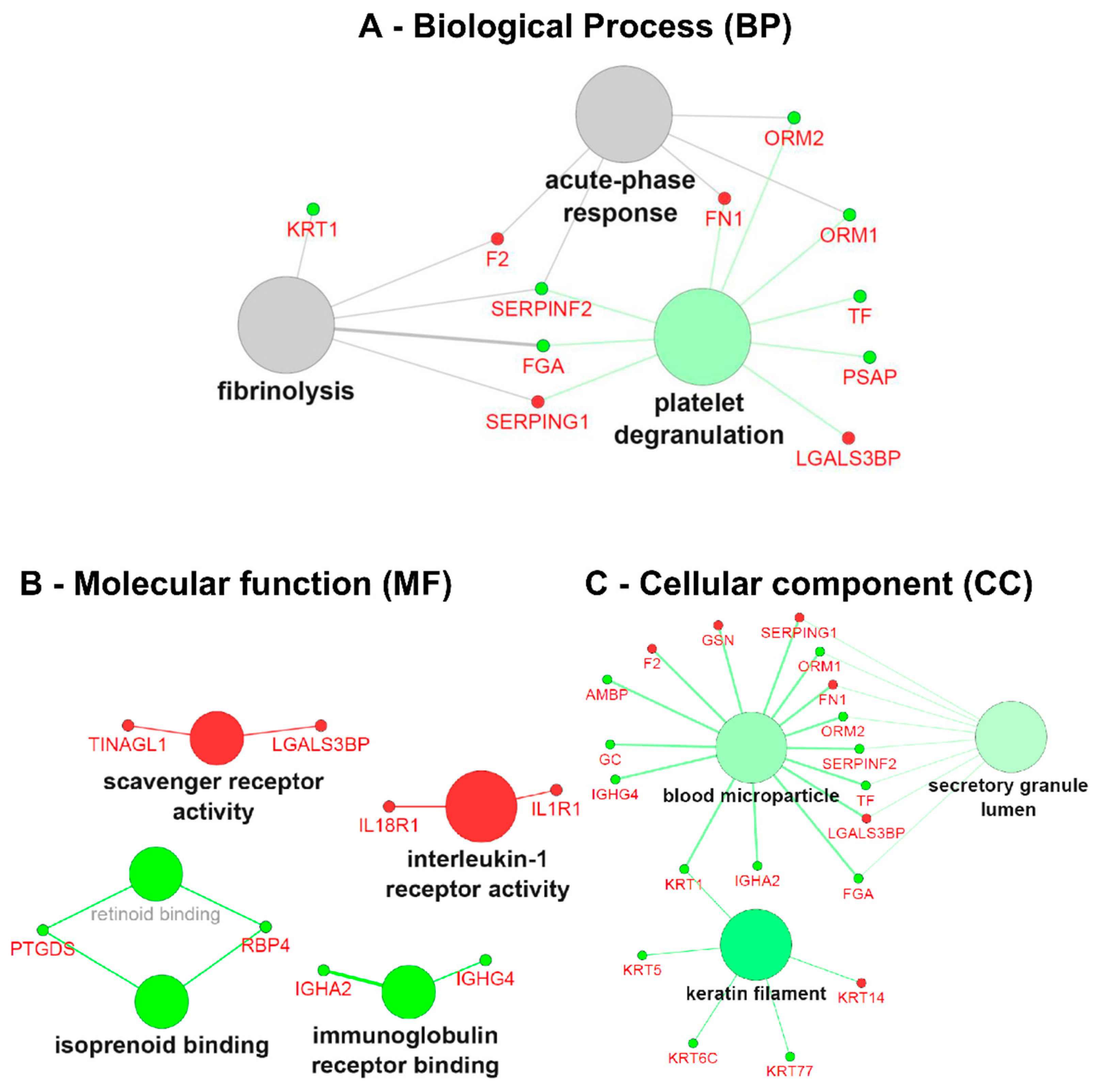 Gene ontology (GO) term clustering (all data) of the naïve group: (A) Biological process (BP), (B) Molecular function (MF) and (C) Cellular component (CC). The increase of node size is associated with an increase of the statistical significance (Bonferroni-corrected p-value), the red node colour denotes an increased regulation of the term/group and green a decrease. Network nodes displayed in grey means that they share an equal number of genes/proteins associated with an up- and down-regulation.