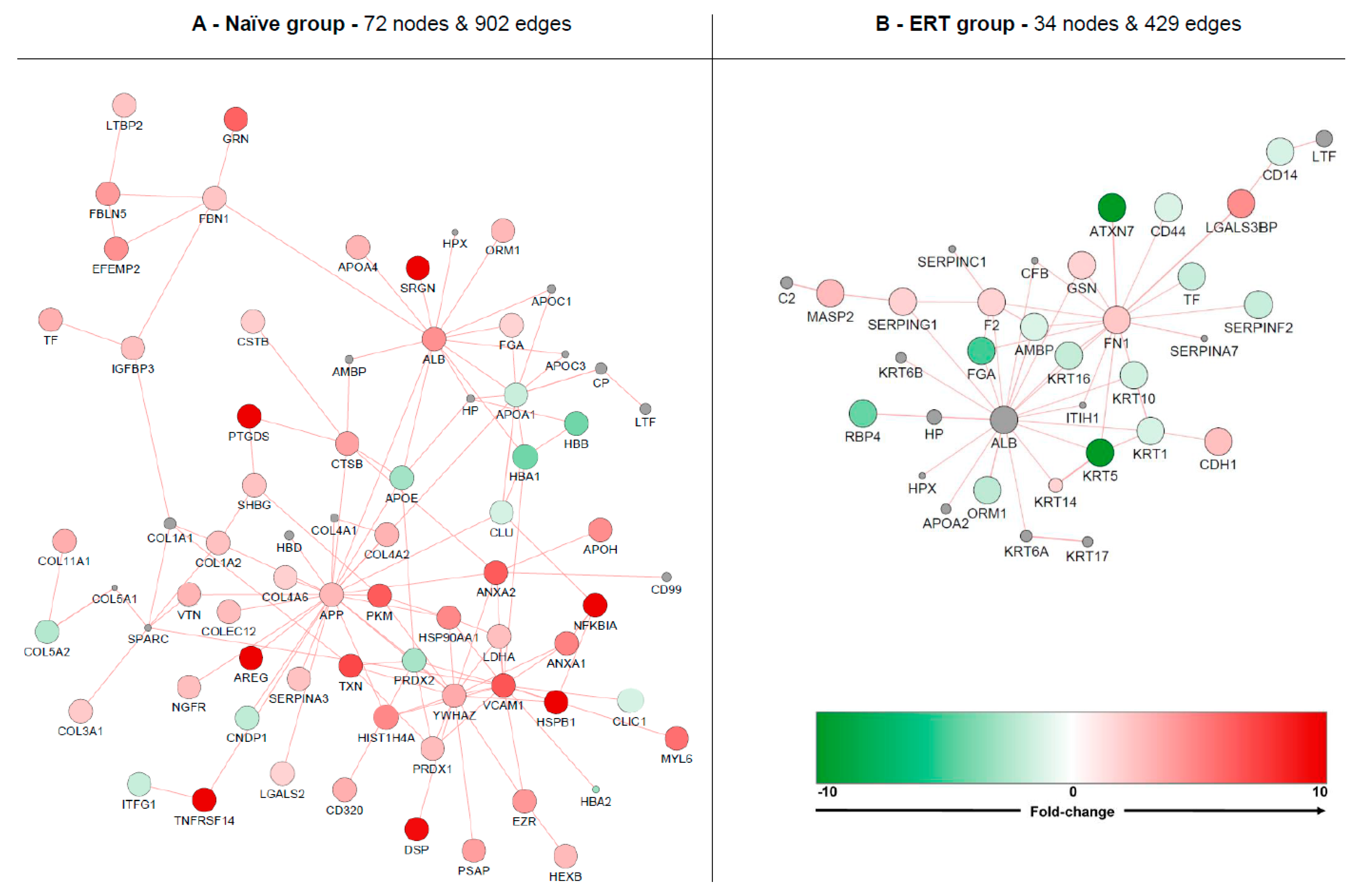 Since not every protein/gene has annotated functions, and in order to cover molecules that are either poorly annotated or have no known function, protein-protein interaction clustering was performed with both datasets (naïve and ERT groups) representing their respective molecular expression using GeneMania app for Cytoscape [17,21] (Figure 6). The displayed networks from the analysis of protein-protein interactions (PPIs) allowed the identification of three highly interconnected nodes or network hubs in the naïve group: amyloid beta A4 protein (APP), 14-3-3 protein zeta/delta (YWHAZ), and serum albumin (ALB) (Figure 6A). In the ERT group ALB is one of the enriched molecules added from the PPI analysis and is shown as a hub of the network cluster. Fibronectin (FN1) is shown as a cluster hub and is overexpressed (Figure 6B).