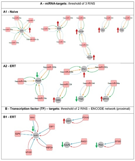 Here, it was possible to pinpoint potential up-stream regulators and their targets for the naïve group (Figure 7A1). Expression of amyloid beta A4 protein (APP) is being regulated by miR-20a, miR-17, miR-520c-3p, miR-106b and miR-106a. Prosaposin (PSAP) is being regulated by miR-19a, miR-130b and miR-19b. Extracellular matrix structural constituents such as the collagen alpha-1(III) chain (COL3A1) is being regulated by both miR-29b and miR-29c and the collagen alpha-2(I) chain (COL1A2) by miR-29c. Ezrin (VIL2) involved in key cytoskeletal structures of the plasma membrane is being regulated by miR-183. Fibrinogen alpha chain (FGA) is one of the primary components of blood clots and is being regulated by miR-144. Prosaposin (PSAP) and fibrinogen alpha chain (FGA) are modulators/regulators, respectively, on e.g., lipid binding and e.g., when involved in structural molecule activity. In our analysis, both proteins were found differentially expressed for the groups of naïve and ERT patients, up and down-regulated respectively. The PSAP gene expression is regulated by the following microRNAs and they are expected to be down-regulated: miR-19a, miR-19b and 130b. FGA gene expression appears to be regulated by miR-144 and by the histone acetyltransferase p300 (EP300) (Figure 7A1,A2,B1). Fibronectin (FN1) binds cell surfaces and various compounds including collagen, fibrin, heparin, DNA, and actin and is being targeted by miR-200b and miR-200c. Gelsolin (GSN), a calcium-regulated, actin-modulating protein is being up-stream regulated by miR-124. Erlin-1 (ERLIN1, SPFH1), a lipid-binding protein, is being regulated by miR-34a (Figure 7A2). Similarly, L-amino-acid oxidase (IL4I1), an enzyme that might play a role in lysosomal antigen processing and presentation, is being regulated at the transcription level by the following transcription factors: protein max (MAX), transcription factor COE1 (EBF1), myocyte-specific enhancer factor 2A (MEF2A), nuclear factor NF-kappa-B p105 subunit (NFKB1), and transcription factor E2F6 (E2F6) (Figure 7B1). Cadherin-1 (CDH1), a calcium-dependent cell adhesion protein with a strong inhibitory effect on APP, C99 and C83 production, is being regulated on the transcription level by the hepatocyte nuclear factor 3-beta (FOXA2). The extracellular sulfatase Sulf-2 (SULF2), an enzyme associated with kidney development, is being regulated by the double-strand-break repair protein rad21 homolog (RAD21) (Figure 7B1).