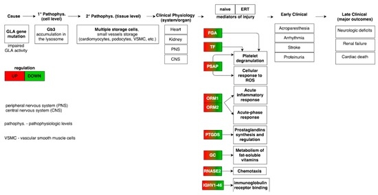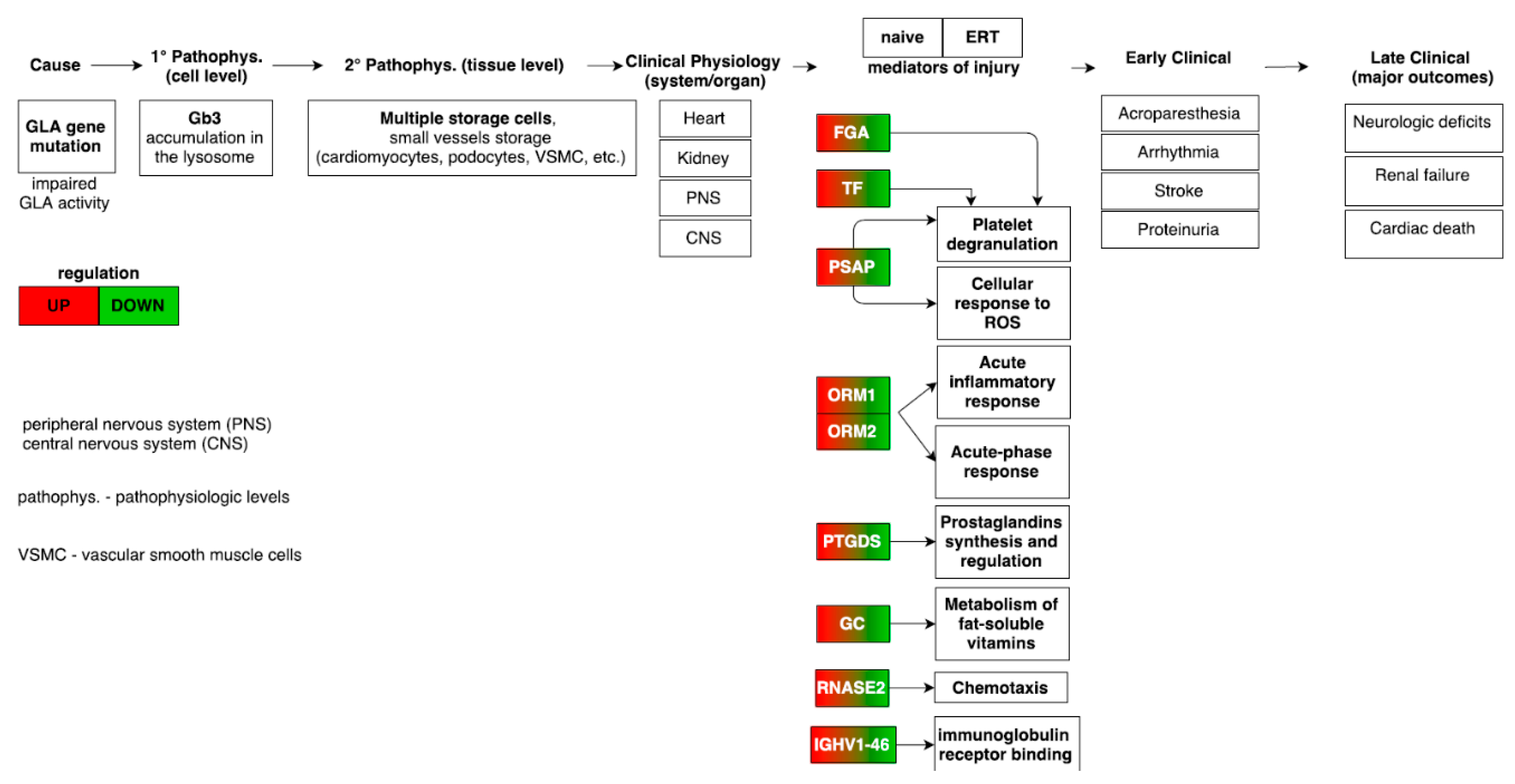 Mapping of the pathophysiologic and molecular features in Fabry-naïve and ERT groups providing the link from disease cause to final major clinical outcomes [34]. The highlighted molecular features from the meta-analysis demonstrates an opposite regulation trend in the Fabry-naïve and ERT groups.
