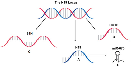 The H19 locus harbors multiple transcripts (Figure 1). The main transcript, H19, functions as the full lncRNA, and it encodes within its first exon two variants of microRNA, miR-675 [22]. There are also two antisense transcripts at the locus, 91H and HOTS. The HOTS transcript can produce a nucleolar protein [27], while 91H appears to function solely as an lncRNA [28]. A review and discussion on the antisense transcripts is presented in Section 6.