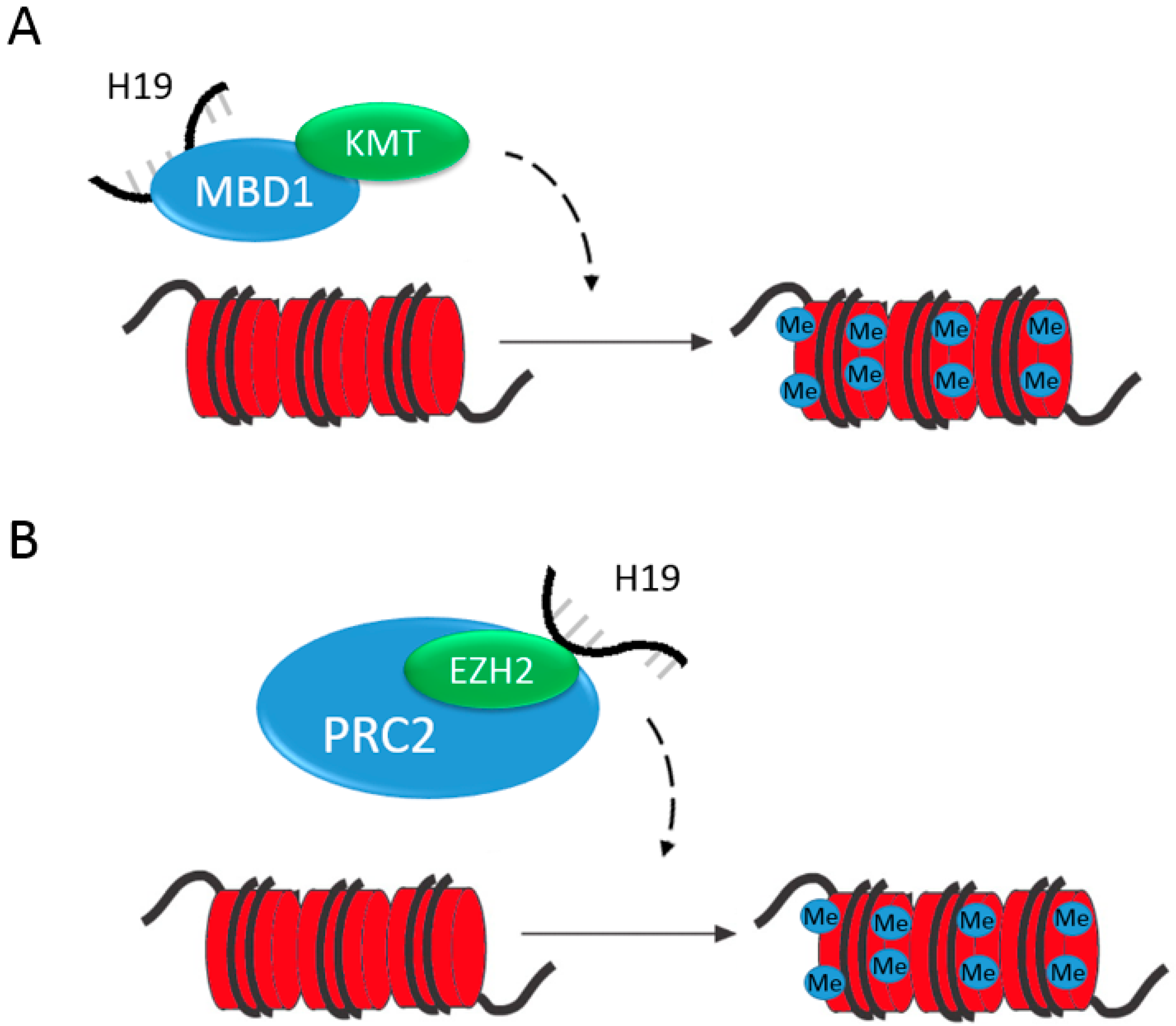 - Monnier, P.; Martinet, C.; Pontis, J.; Stancheva, I.; Ait-Si-Ali, S.; Dandolo, L. H19 lncRNA controls gene expression of the imprinted gene network by recruiting mbd1. Proc. Natl. Acad. Sci. USA 2013, 110, 20693–20698. [Google Scholar] [CrossRef] [PubMed]