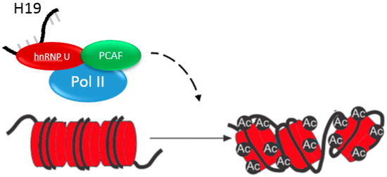 H19 can also activate gene transcription. H19 binds hnRNP U, which is a member of the complex with RNA Polymerase II and PCAF, a histone acetyltransferase. H19 binding results in the upregulation of the miR-200 family of microRNAs through histone H3 acetylation.