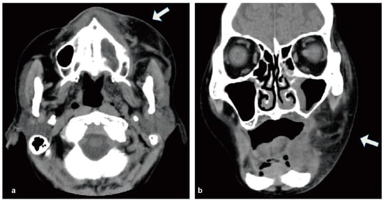 Enhanced CT revealed the soft tissue swelling widely extended to the left submandibular space without abscess formation (arrowhead). (a) Axial scan; (b) coronal scan.