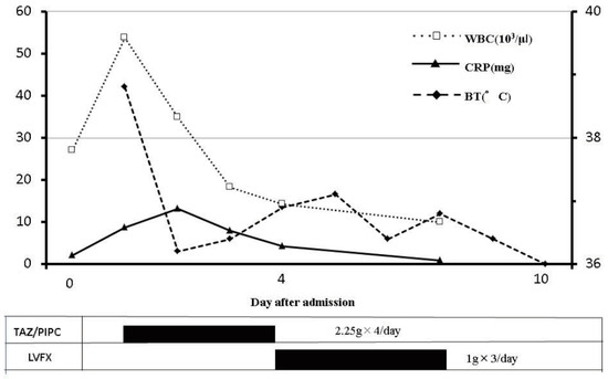 The time course of treatments and inflammatory changes. Intravenous antibiotic treatment was started on day 0. WBC, white blood cell; CRP, C-reactive protein; BT, body temperature.