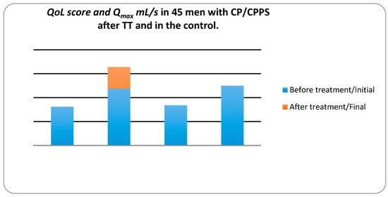 Quality of life (QoL) score and maximum urinary flow rate (Qmax) mL/s in 45 men with CP/CPPS after TT and in the control group measured by the National Institute of Health-Chronic Prostatitis Symptom Index (NIH-CPSI) and uroflowmetry.