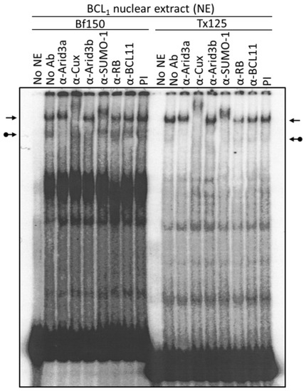 To re-examine these issues, we prepared nuclear extracts from the mature B cell lines, BCL1 and M12.4, and performed EMSA. As shown in Figure 2, the Arid3a-containing complex has a relatively higher affinity for Bf150 than for Tx125. Conversely, the NF-μNR complex exhibits higher affinity for Tx125 than for Bf150. The differential affinity of Arid3a and NF-μNR were observed in both M12.4 and BCL1 cells (Figure 2). In addition, we consistently observed that anti-Cux antiserum slightly interfered with Arid3a-DNA binding in BCL1 but not in M12.4 (Figure 2 and Figure 3). This suggested that the complexes in the two B cell lines are not identical.