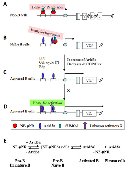 Hypothetical function of Arid3a in regulating IgH transcription through 5′ MARs. (A) IgH VH-associated promoter region may be sequestered within a sub-nuclear region(s) in which most transcription activities are repressed in non-B cells; (B) The interaction of Arid3a with CDP/Cux may change the DNA binding affinity of the NF-µNR complex and/or increase the accessibility of other components which may comprise the Arid3a complex. These changes in NF-µNR may alter the complex such that it can dissociate from MARs; (C) Activation of the B cells increases the affinity of Arid3a for both MARs, allowing the IgH promoter to be liberated from the repressive region by displacement of NF-µNR; (D) As cells become more activated and move toward terminal differentiation, the Arid3a complex may change its components so as to re-localize the IgH promoter to a euchromatic sub-nuclear region; (E) Hypothesized equilibrium of Arid3a and NF-µNR during B cell development.