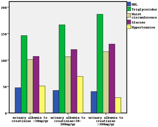 Furthermore, the unadjusted association between classified albuminuria and separated MetS components showed that high triglycerides, high glucose, manifested hypertension and low HDL were significant factors, although only the high triglycerides and hypertension were found to be important factors for classified eGFR. As albuminuria determines the presence of underlying kidney damage, even with normal or high eGFR, the findings related to the CKD classification based on albuminuria may be more valid to define the role of metabolic abnormalities on kidney function, in comparison to the findings regarding classified eGFR.