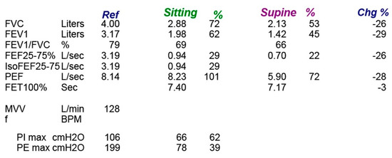 Spirometry of patient with bilateral diaphragmatic palsy showing significant drop of lung functions on supine position.