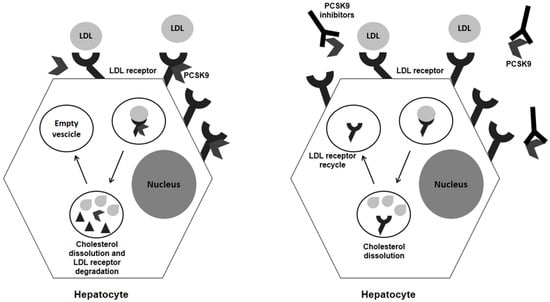A better understanding of the PCSK9 pathway showed that this molecule promotes the degradation of LDL receptors by forming an enzyme–substrate complex, mainly in the liver. The cell-surface complex LDL-R/LDL is transported to the endosomes via endocytosis, where LDLs are released in acid conditions. Within the endosome, LDL is degraded to amino acids and cholesterol while LDL-R is transported back to the cell surface, but, if bound to PCSK9, LDL-R will be degraded too (Figure 1). Therefore, PCSK9 inhibition may be an effective strategy to promote LDL-R recycling, thus reducing circulating LDL particles (Figure 1). The rate of plasma LDL-C decrease is approximately 45–60%, whether used alone or in combination with a statin. Addition of an anti-PCSK9 antibody to standard therapy—with statin alone, or statin combined with Ezetimibe—resulted in a further reduction of plasma LDL-C concentrations (up to 60%) and a halved cardiovascular event rate compared to the placebo [].