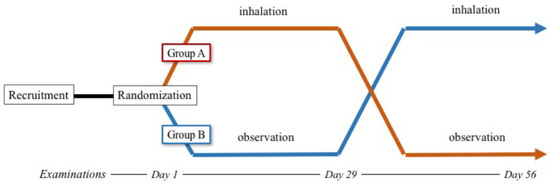 The enrolled participants were randomly divided into two groups, A and B, following a 2-week baseline period. The participants inhaled 18 μg tiotropium once daily between 6:00 a.m. and 8:00 a.m. through a dry powder inhaler device (HandiHaler®; Boehringer Ingelheim, Ingelheim am Rhein, Germany) [13]. Inhalation of tiotropium took place after the patients were given adequate instruction and training by professional nurses. Continuation of inhalation was confirmed at each outpatient examination. Participants who could not continue the inhalation therapy were excluded from this clinical trial. The participants in group A received tiotropium once a day for 28 days and underwent observation for another 28 days. The participants in group B were observed without inhalation for 28 days and then received tiotropium for 28 days (Figure 1). During these protocols, the other medications taken by the participants were unchanged. We measured the pulse oximetry oxygen saturation (SpO2), pulmonary function, 6-min walk distance (6MWD), echocardiographic parameters, and laboratory markers on days 1, 29, and 56. The study protocol was approved by an independent ethics committee, and written informed consent was obtained from all patients.