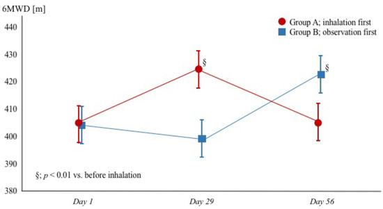 Treatment with tiotropium inhalation improved the 6MWD from 405 ± 57 to 424 ± 46 m (p < 0.01) in group A and from 399 ± 74 to 422 ± 58 m (p < 0.01) in group B, and termination of inhalation reduced the distance in group A to 405 ± 63 m (p < 0.01) (Figure 2).