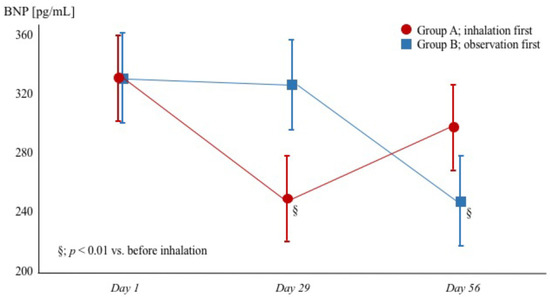 Changes in BNP levels in patients with heart failure with reduced ejection fraction and chronic obstructive pulmonary disease. Red circles (●) and blue squares (▪) represent group A (tiotropium + observation) and group B (observation + tiotropium), respectively. BNP = brain natriuretic peptide.