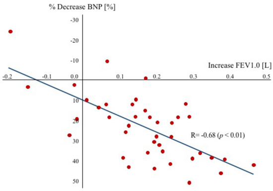 Relationship between the percentage decrease in plasma BNP levels and the absolute increase in FEV1.0. A significant relationship was observed between the percentage decrease in BNP and the increase in FEV1.0. BNP = brain natriuretic peptide, FEV = forced expiratory volume.