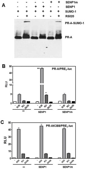 3.2. SENP1 deSUMOylates PR-A, Which Enhances Its Transcriptional Activity