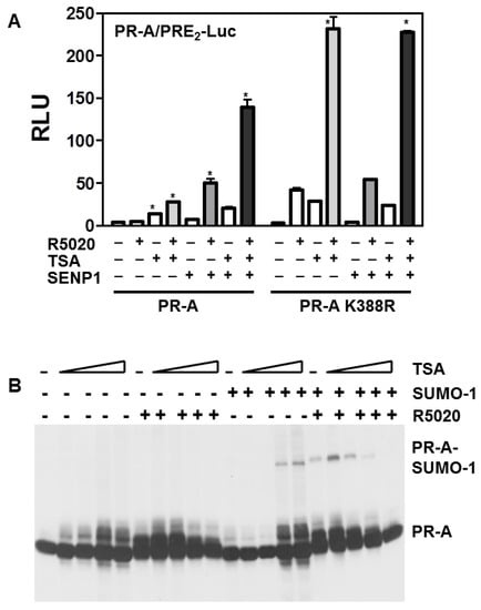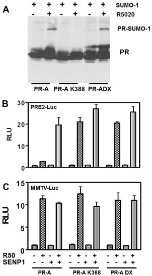 3.1. SUMOylation Suppresses PR Transcriptional Activity in a Promoter Dependent Manner