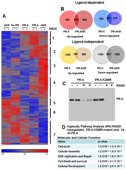 For gene expression profiling [], PR-negative T47D-Y cells (no PR), plus derived cells stably expressing WT PR-A or the RPR-A K388 mutant, were cultured as above in vehicle control or 10 nM R5020 for 24 h. Total RNA was extracted (RNAeasy; Qiagen, Baltimore, MD, USA), cRNA was labeled and hybridized to U133 Plus 2 microarrays (Affymetrix, Santa Clara, CA, USA) as described []. Partek Genomics Suite 6.0 (Partek Inc., Palo Alto, CA, USA) was used to normalize raw data followed by ANOVA to identify genes differentially expressed among groups in a significant manner. A gene was considered significantly changed, if it had an adjusted p < 0.05 and fold-change ≥1.5. Heat maps and Venn diagrams were generated using Partek Suite 6.0. Ingenuity Pathway Analysis was used to identify biological processes enriched for differentially expressed genes. All microarray data have been deposited in the Gene Expression Omnibus Database (accession number GSE108607 (http//www.ncbi.nlm.nih.gov/geo)).