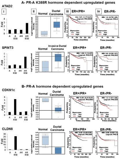 PR-A SUMOylation plays a functional role in tumor survival. Hormone dependent gene expression by PR-A K399R (A) or PR-A (B). Relative expression levels of ATAD2, SPINTS3, CDKN1c, and CLDN8 (PR-A target genes) in T47D breast cancer cells that stably express WT PR-A or PR-A K388R (i), and in breast cancer patient cohorts (ii) (Oncomine database). Kaplan–Meier survival curves showing relationship between high (red line) and low levels (black line) of target gene expression and overall survival in patients with ER-positive tumors (iii) or ER-negative tumors (iv). Statistical data are show in the upper right corner of each box with p ≤ 0.05 considered significant.