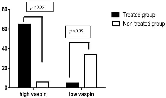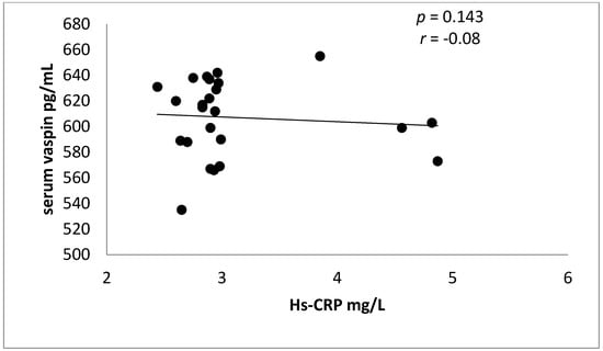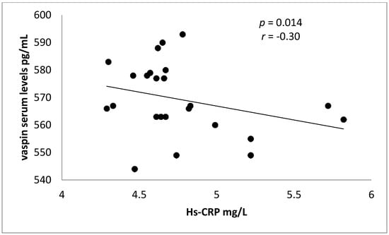 Visceral Adipose Tissue-Derived Serpin (vaspin) is a novel adipokine that is expressed mainly in visceral white adipose tissue []. The up-regulation of vaspin synthesis may signify a response to the antagonizing action of fat-derived proteases that antagonize the insulin action; therefore, up-regulation of vaspin expression may be regarded as a defense mechanism against insulin resistance []. Additionally, vaspin was negatively correlated with blood pressure in obese patients, while vaspin levels were decreased in patients with impaired endothelial function []. Inflammation was thought to be one of the major causes of early atherosclerosis and its complications []. Recently, a study predicted that adipokines including vaspin have a local role in preventing the progression of atherosclerotic growth of [].
