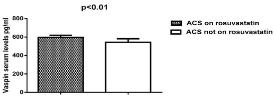 Thus, vaspin serum levels were high in patients with ACS on rosuvastatin therapy (595.62 ± 23.65) compared to patients with ACS not on rosuvastatin therapy (542.75 ± 38.95), see Figure 4.