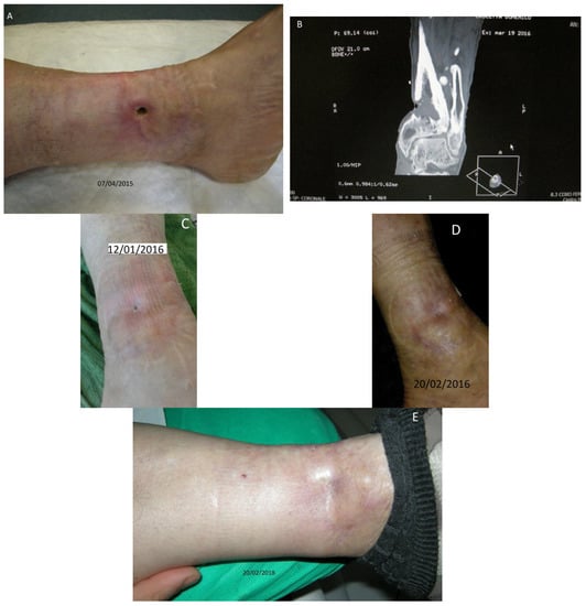 Patient No. 1: C.D., 68-year old male, diabetic for 25 years; Body Mass Index (BMI) = 35.5; non-smoker; nonalcoholic; having a cutaneous ulcer on the inner side of the left leg for more than 20 years (Figure 1A–E), penetrating the structure of the tibia, with bone lesion (Figure 1B). The patient was currently taking glicazide 60 mg at breakfast, sitagliptin phosphate monohydrate/metformin hydrochloride 50 mg + 1000 mg at lunch and dinner; did not present sensory-motor polyneuropathy; fasting blood glucose ~150 mg/dL; Urea 29 mg % (normal range nr: 10–50); HbA1c DCCT = 6.7% (nr: 4–6); HbA1c IFCC = 50 mmol/mol (nr: 10–50).