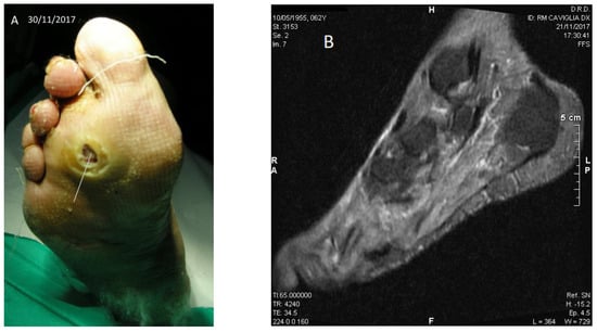 The diagnostic assessment of OM in the patients was performed first of by the Probe-to-Bone method (PTB) and then through an MRI (see figures below) and a bone cell culture.