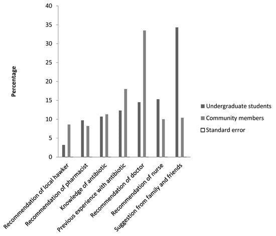 Responses from the undergraduate students suggest that the commonly self-diagnosed illnesses treated with antibiotics were malaria (14.5%), typhoid (13.1%), stomach pains (12.7%), diarrhea (11.9%), cold (0.8%), ear and throat pain (1.2%), asthma (1.6%), sinusitis (2.2%), dental caries (2.8%), and fever (3.9%). On the other hand, the community members were more likely to use antibiotics for illnesses such as dysentery (19%), infection (17%), typhoid (13%), sinusitis (1.8%), asthma (2.2%), food poisoning (3.1%), and ear and throat pain (3.2%), Figure 2.