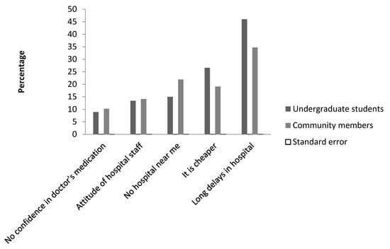 Data collected from undergraduate students showed that suggestion from family and friends (34.3%) was the most common explanation for self-medication of self-diagnosed illnesses. In contrast, in the community, prescription by physicians (33.5%) was the highest response for choice of antibiotics, followed by previous experience with the antibiotic (18%), and knowledge of the antibiotic (11%) (Figure 3). Reasons reported for engaging in self-medication among undergraduate students and community members were due to long delays in the hospital (46% and 35%), it being cheaper not to go to hospital (26% and 19%), and the distance to the hospital (15% and 21%) (Figure 4).