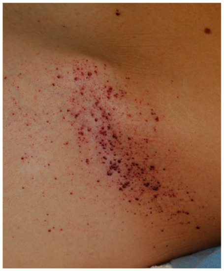 A 33-year-old man presenting with multiple red-blue to black papules on his right hip and penis was referred to our clinic. Physical examination revealed multiple warty, keratotic, red-blue to black papules with a diameter of 2–5 mm on the areas mentioned above (Figure 1).