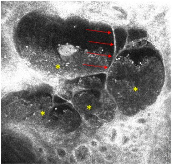 Handheld reflectance confocal microscopy examination of an angiokeratoma. Hypo-reflective oval areas separated by fine septa (→) and containing hyper- and medium-reflective cells are visible (*).