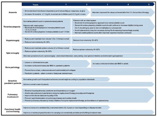 Generally speaking, the objectives in GD are to: (1) stabilize, (2) improve, and (3) reverse (if possible) clinical signs and symptoms. In 2004, Pastores et al. published therapeutic goals for type I GD patients [20] (Figure 2). These recommendations were recently revised to include the prevention of long-term complications or associated comorbidities [21] (i.e., residual skeletal disease, monoclonal gammopathy of undetermined significance, and certain types of cancer, pulmonary hypertension, Parkinson disease, and metabolic syndrome). These additional goals reinforce the importance of taking a multidisciplinary point of view in Gaucher disease, particularly when bone disease; pregnancy, multiple myeloma and Parkinsonism occur. Bone disease is common, frequently severe and unpredictable in terms of presentation, being independent of visceral and hematologic manifestations and the genotype, and is a criterion for starting enzyme replacement treatment (ERT) [22]. For GD women who are pregnant it is important to remember the tendency to worsening anemia (as well decreased platelets), the potential for bone crisis (especially after delivery), and the potential need for ERT dosage adjustment. Especially important are considerations surrounding anesthesia and delivery [23].
