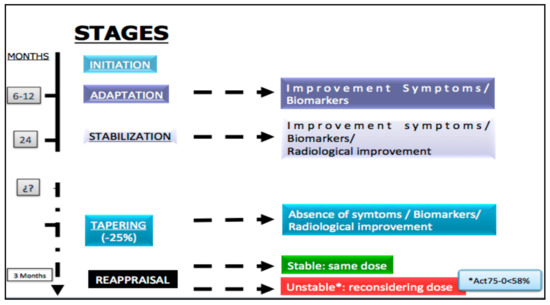 - Tapering: After stabilization of the patient, which is defined by the absence of symptoms, normalization of biomarkers and demonstration of a radiological improvement, the tapering stage can be initiated, with a dose reduction of 25% in the case of ERT.