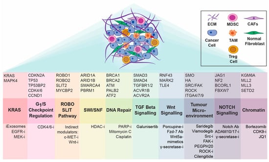 Building on these findings, Connor et al. [] subsequently provided further insight into the molecular pathology of PDAC, describing an interesting correlation between signatures that define double-stranded DNA break repair (DSBR) and mismatch repair (MMR) deficiencies and specific immune profiles. Specifically, genes associated with increased cytolytic activity of infiltrating CD8-positive T lymphocytes plus increased expression of immune checkpoint genes (CTLA-4, PD-L1, PD-L2, and indolamine 2,3-dioxygenase 1 (IDO-1) were increased in DSBR and MMR cases within the examined cohort [], which was similar to the expression patterns observed in melanomas responsive to checkpoint blockade. Importantly, this suggests that similar to other solid cancers [], pancreatic tumours with a high mutation burden may present a viable target for immune-modulating combination therapies. Despite the explosion in “omic”-characterisation of pancreatic cancer, which has produced unprecedented insights into the complex mutational and changing landscape of this disease, the established molecular taxonomy is yet to be utilised clinically when establishing effective treatment plans. Moreover, several networks, including ROBO/SLIT and TGF-beta signalling, can play either a tumour-suppressive or tumour-promoting role, that is highly context and cell type dependent, and are therefore difficult to target therapeutically [,,,,]. This duality assigned to TGF-beta function, for example, was recently comprehensively examined in select genetic models of PDAC, whereby the authors showed that the TGF-beta tumour suppressive role involves epithelial-to-mesenchymal transition (EMT)-associated disruption of a key oncogenic transcriptional network []. This is particularly interesting, given that EMT, a developmental program previously associated with acquisition of invasive, highly malignant features in pancreatic tumours [], here through a Sox4-dependent mechanism was shown to promote apoptosis []. Despite these challenges, characterisation of several major pathways frequently altered in PDAC [,] has already identified numerous opportunities for therapeutic development, [,,,] (Figure 1), with early successes already on the horizon [,,], and discussed below.