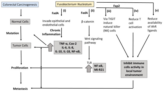 Several studies using immunoassays in colorectal tissue and in vitro cultures demonstrate that Fn infection increases the expression of inflammatory cytokines in tumor tissue, including IL-6, IL-8, TNF-α, and Cox-2, and these cytokines are capable of promoting tumor development [39,46,47,48]. Ye et al. found that Fn can trigger the release of chemokine CCL20 in colorectal-cancer cells cultured with Fn [49]. Moreover, Fn stimulates macrophage activation, migration, and tumor infiltration [49,50]. NF-κB, a transcription factor thought to have a critical role in tumor growth [51], is raised in Fn-enriched CRC [43,46].