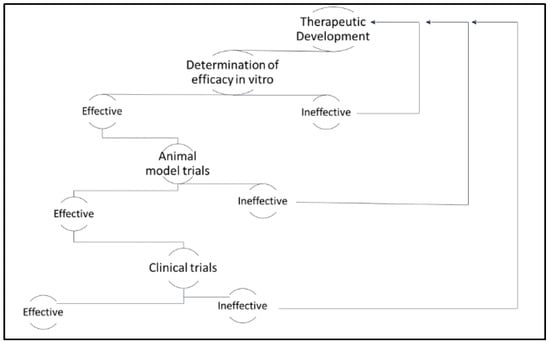 Diagram of therapeutic application post-therapeutic development. Therapeutics that are determined efficacious in vitro are applied in animal model trials. Therapeutics that are determined efficacious in animal model trials are applied in clinical trials. At any point, if the therapeutic is determined to be ineffective, researchers must return to the therapeutic development stage.