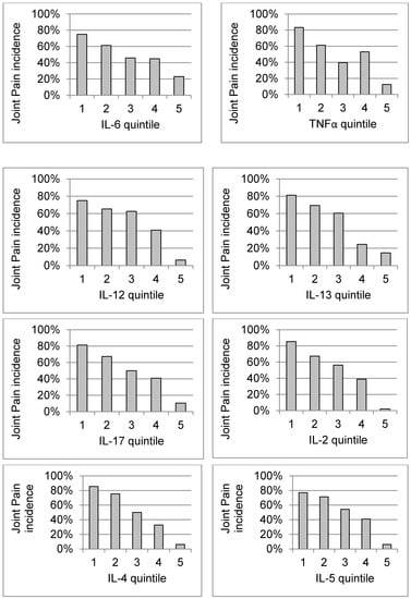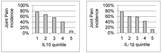 Cytokine distributions were examined with histograms and all were highly positively skewed, often with outliers. p-values for the Shapiro–Wilks test of non-normality, QQ plots, and the mean and standard deviation versus median and interquartile range were examined. The QQ plot for normally distributed variables shows that the data points were aligned in a linear arrangement (age plot), while the shape becomes either S-shaped or J-shaped when there is non-normality and/or outliers as shown in the graphs. The Kruskal–Wallis test was used to test for differences in the distribution location (median) for patients with versus without joint pain, for each cytokine. Each cytokine was significantly non-normal (all p < 0.0001). We therefore coded each cytokine level into quintiles. The association of a cytokine quintile with joint pain was examined with a chi-square test and graphed. Spearman correlations between cytokine levels were examined. To understand which cytokines had independent associations with joint pain, we used a multivariable logistic regression model, also including age and sex as covariates. Stepwise selection was used with p < 0.20 required for model entry and exit. Based on the final model, we calculated each subject’s probability of having joint pain using the logistic model. The probability values were coded into quintiles, and the association of the probability quintiles with joint pain was examined with a chi-square test. Statistical analyses were conducted using SAS software, version 9.4 (SAS Institute Inc., Cary, NC, USA).