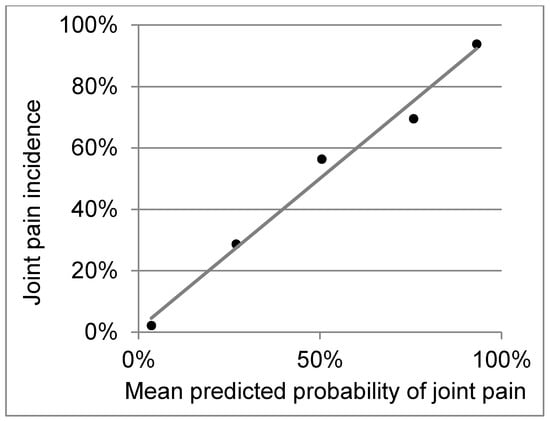 Calibration of the logistic regression model’s risk scores versus incidence of joint pain. There is very strong correspondence between the predicted probability and the observed incidence of joint pain across risk quintiles.