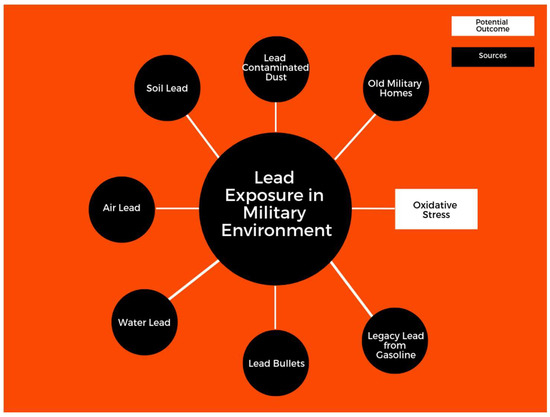 In military environments, the resuspension of dust, vehicular emissions, heavy machinery operations, and oil usage can serve as sources of lead exposure. Shooting with lead-contaminated ammunition is one of the primary sources of lead exposure, as the discharge of lead dust and gases can serve as a source of significant exposure. Blood lead levels (BLLs) in shooters are associated with lead in the air, lead aerosol from guns, the number of bullets fired, and the type of gun used [6]. Figure 1 gives potential sources of lead exposure in military environments.