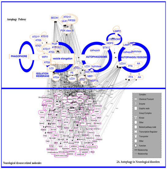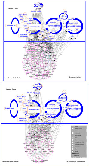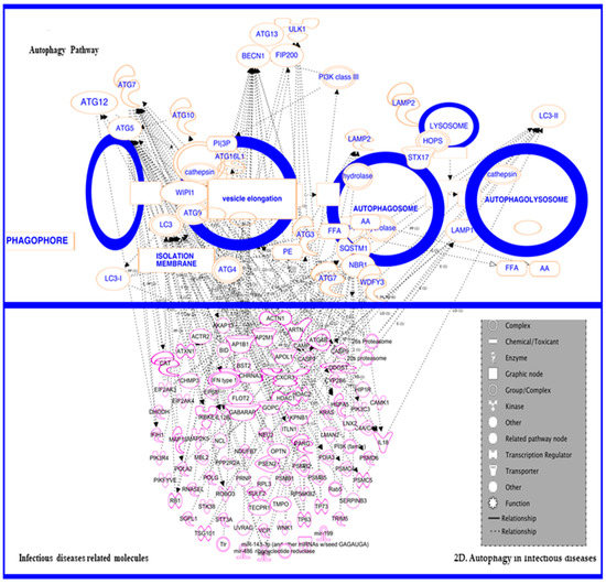 The interconnection of autophagy-related proteins in (A) neurological diseases, (B) cancer, (C) renal disease, and (D) infectious diseases. All these figures represent the critical events and key molecules which are connected between autophagy and diseases. In panel 2A, the autophagy proteins, namely LC3-II, BECN1, ATG 13 complex, LAMP2, ATG10, ATG12, ATG7, and ATG5, have been predicted to interlink with neurological diseases-related molecules, such as AMBRA, GABARAPL, VPS18, VPS39, VPS33A, OPTN, KEAP1, Rab5, TRIM55, TRIM33, AKT1S1, APOL1, AIM2, MAP1B, and others. In panel 2B, autophagy proteins, namely LC3-II, BECN1, ATG 13 complex, LAMP2, ATG10, ATG12, ATG7, and ATG5, have been predicted to interlink with cancer-related molecules, such as APOBEC3B, VPS41, TRIM55, TRIM16, AKT1S1, APOL1, APOL6, ATG14, CNN3, MAP1B, ROBO3, SYNPO2, PUM2, SAFB2, and others. In panel 2C, autophagy proteins, namely LC3-II, BECN1, ATG 13 complex, LAMP2, ATG10, ATG12, ATG7, and ATG5, have been predicted to interlink with renal disease-related molecules, such as APOBEC3B, TAB3, VPS33A, TRIM16, WDR41, WIP12, STK4, TFEB, SNAPC4, PIK3C2A, PINK1, MDK, OPTN, KEAP1, FNIP-1, and others. In panel 2D, autophagy proteins, namely LC3-II, BECN1, ATG 13 complex, LAMP2, ATG10, ATG12, ATG7, and ATG5, have been predicted to interlinks with infectious disease-related molecules, such as TLR, UVRAG, WNK1, TP63, TP73, TRIM5, SERPINB3, Rab5, RPL3, IL-18, CXCR3, APOL1, ACTN1, ACTR2, BST2, BID, ATXN1, CAT, CHMP3, NCL, ITLN1, LNX2, PARG, and others. Using a build tool in the pathway developer of IPA (Ingenuity Pathway Analysis), the Autophagy–Canonical pathway was developed; then, the grow tool was used to connect the autophagy-related proteins to the neurological diseases, cancer, renal diseases, and infectious diseases pathways.