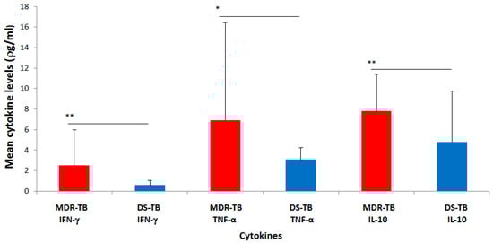 Mean plasma concentrations (ρg/mL) of IFN-γ, TNF-α and IL-10 in MDR-TB and DS-TB patients. Graph of data represents mean ± standard deviation, where ** p < 0.01 and * p < 0.05.