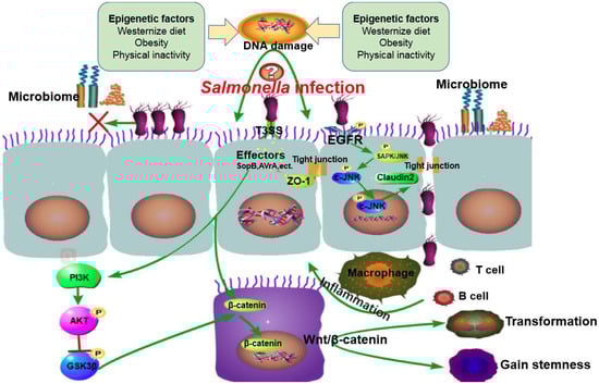 Salmonella infection plays an important role in cellular phenomena, such as host cell transformation, stem cell growth, inflammation, and gut microbiota regulation. Salmonella can induce cellular transformation by activating the Wnt/β-catenin signaling pathway. Studies report that Salmonella can induce follicular-associated epithelial cell transformation into M cells by epithelial-mesenchymal transition (EMT), thereby promoting its colonization and invasion [114]. GSK3β is a key complex in Wnt/β-catenin signaling, which interacts with β-catenin, causing its phosphorylation and degradation. SopB can inhibit GSK3 by activating Akt, [113] which phosphorylates β-catenin increasing its transcriptional activity and ultimately activating the Wnt/β-catenin pathway [115]. Wnt/β-catenin activation increases the expression of EMT transcriptional activators (snail, slug, and twist) and down-regulates the expression of the tumor suppressor E-cadherin [116]. T3SS is also important for neoplastic transformation of epithelial cells. It has been shown that Apc+/min mice (with c-Myc overexpression) [117] infected with WT S. Typhimurium developed cancer in their colon, but Apc+/min mice infected with ΔprgH mutant Salmonella (lacking functional T3SS) did not [118]. Mouse embryonic fibroblasts (MEFs) with genetic susceptibility can transform after WT Salmonella infection because effectors of the T3SS increase AKT and MAP kinase activities, whereas mutant Salmonella lacking effectors SopB, SopE, SopE2, and SptP cannot activate the AKT and MAP kinase [119]. The transformation to cancerous cells persists even after Salmonella has been eradicated from the host. Studies have also shown that during Salmonella infection, the organism can modify the transcriptome of the host cell and induce epigenetic changes [118]. In our previous studies, we demonstrated that Salmonella protein AvrA activates the Wnt/β-catenin pathway, which is essential for the maintenance of the intestinal stem cell niche [43]. Salmonella infection can also regulate the intestinal stem cell markers, Lgr5 and Bmi1 [120].