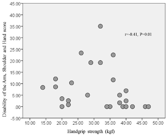 Figure 1 shows the relation between handgrip strength and the DASH score at three months following cardiac surgery. The DASH score correlated negatively with handgrip strength (r = −0.41, p = 0.01) but did not correlate with knee extensor muscle strength (r = −0.32, p = 0.09).