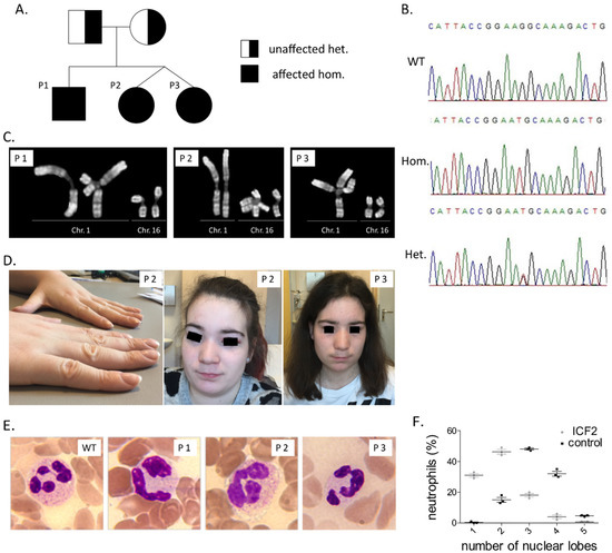 Segregation of ZBTB24 c.1222 T>G mutation in studied patients’ family. Pedigree (A) and representative sequencing chromatograms (B) are depicted. (C) Representative images of all three studied patients showing spontaneous under-condensation of subcentromeric constitutive heterochromatin of chromosomes 1 and 16 as well as multibranched chromosomes. (D) Flat nasal bridge in patients P2 and P3 and nail clubbing in patient P3. (E) Blood smears stained with hematoxylin-eosin, depicting pseudo-Pelger–Huët anomaly of neutrophils, magnification: 100×. (F) Dot plot of nuclear lobe numbers of neutrophils of the three patients and three healthy blood donors.