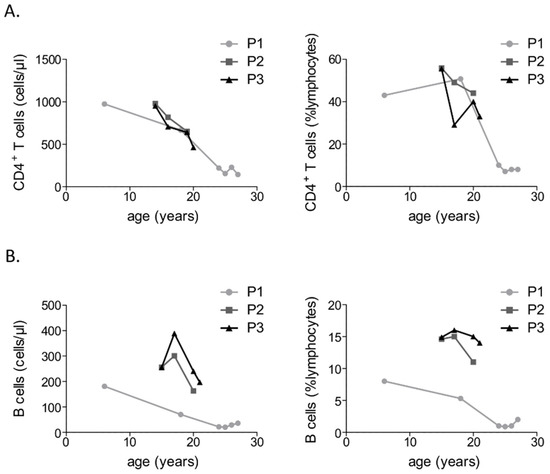 Progressive depletion of CD4+ T cells (A) and CD19+ B cells (B) in three patients with ICF2.