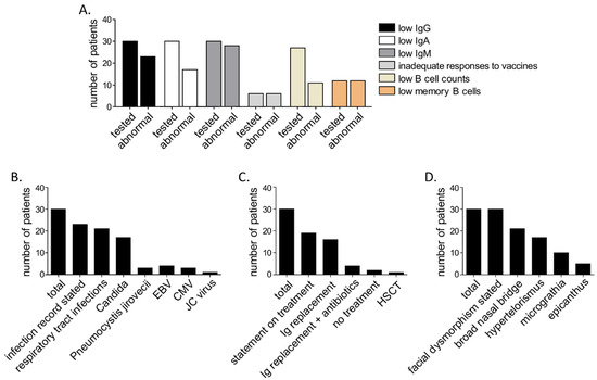 Summary of characteristics of all (n = 30, including the here presented patients), so far reported patients with ICF2. (A) Summary of immunological findings, (B) Infections, (C) treatment and (D) facial dysmorphism.