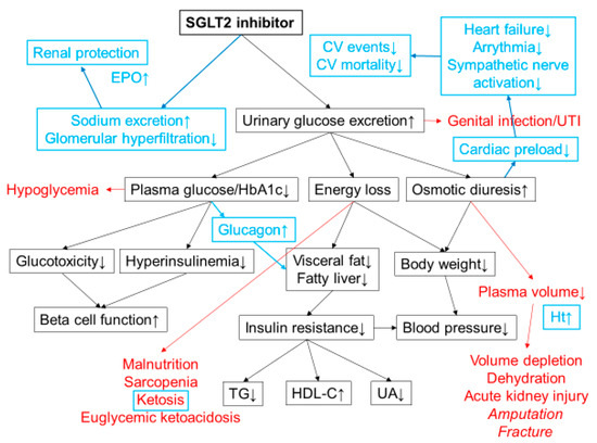 Mechanisms of action of SGLT2 inhibitors. SGLT2 inhibitors lower plasma glucose level by increasing urinary glucose excretion. Energy loss by SGLT2 inhibitor treatment promotes weight loss and improves insulin resistance and various metabolic parameters. Possible adverse effects are shown in red. Increased risk of lower-extremity amputation and bone fracture has been reported in a clinical trial with canagliflozin. The cardiorenal benefits shown in CVOTs have revealed additional mechanisms of action of SGLT2 inhibitors that were unknown at the time of launch (highlighted in blue). Osmotic diuresis and natriuresis are likely to be the major mechanisms of the cardiorenal benefits of SGLT2 inhibitors. Increases in blood ketone bodies and hematocrit may also contribute to the cardiorenal benefits. CV; cardiovascular, TG; triacylglycerol, HDL-C; high density lipoprotein cholesterol, UA; uric acid, Ht; hematocrit, UTI; urinary tract infection, EPO; erythropoietin.