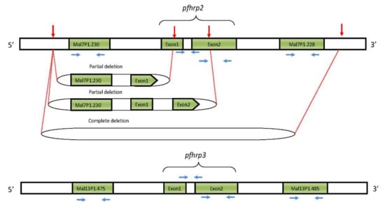 Illustration of pfhrp2 and pfhrp3 genes and their flanking regions (green color), chromosome breakage and rejoining points (in red arrows) and the primer locations for the target genes (blue arrows).