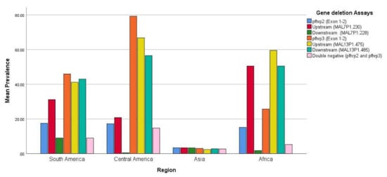 Studies in India reported similar frequencies of parasites lacking pfhrp2 and pfhrp3 and their corresponding flanking regions [55,56,57]. Figure 3 summarizes the prevalence and distribution of pfhrp2, pfhrp3 and the flanking gene deletions in different continents. As shown in Figure 3, the lowest prevalence of pfhrp2/pfhrp3 and the respective flanking gene deletions was reported in Asia. In one of the studies, deletions of the two genes were observed in symptomatic individuals with high parasitemia [56], contrary to previous observations of pfhrp2 and pfhrp3 deletions in asymptomatic individuals with low parasitemia [60].