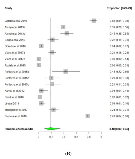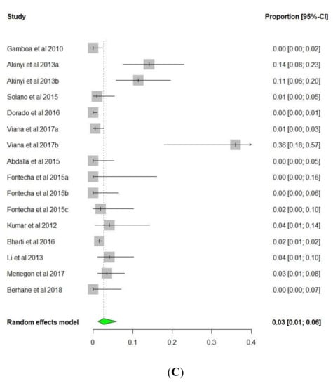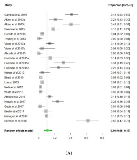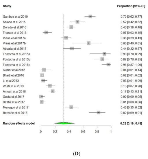 The results of the meta-analysis with random effects model are presented in Figure 4. Based on the estimates, we noted that the proportion of pfhrp2 exon1-2 among the included studies ranges from a minimum of 0.01 (95% CI: 0.00, 0.04) [53] to a maximum of 0.62 (95% CI: 0.47, 0.75) [66]. Furthermore, the pooled proportion of pfhrp2 exon1-2 was 0.10 (95% CI; 0.06, 0.17) (Figure 4A). The heterogeneity test showed presence of lack of uniformity, p-value = < 0.001. Similarly, the pooled prevalence of Upstream MALP1.230, Downstream MALP1.228, pfhrp3 exon1-2, Upstream MAL13P1.475, Downstream MAL13P1.485 and Double negative for pfhrp2 and pfhrp3 were 18.00%, 3.00%, 32.00%, 38.00%, 35.00% and 8.00%, respectively (Figure 4B-G).